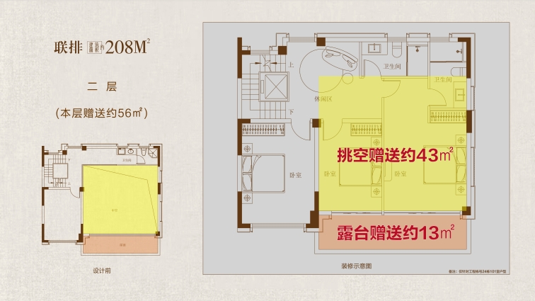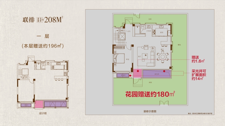 208戶(hù)型鑒賞: 大花園:戶(hù)均擁有約120㎡以上私屬庭院,可打造花園、茶室或親子活動(dòng)空間,延伸生活詩(shī)意 三開(kāi)間:約10.7米南向面寬,首層層高約3.6 米,采光通風(fēng)俱佳,營(yíng)造朗闊起居格局。 高附贈:地下室面積約108㎡,約 5.5 米挑高,可隔成兩層,打造影音室、健身房、酒窖等多元功能區;一層餐客廳挑空,可拓展約43㎡贈送空間;二層、三層配備景觀(guān)露臺,陽(yáng)臺半贈送;四層星空露臺全贈送,解鎖生活多重想象。